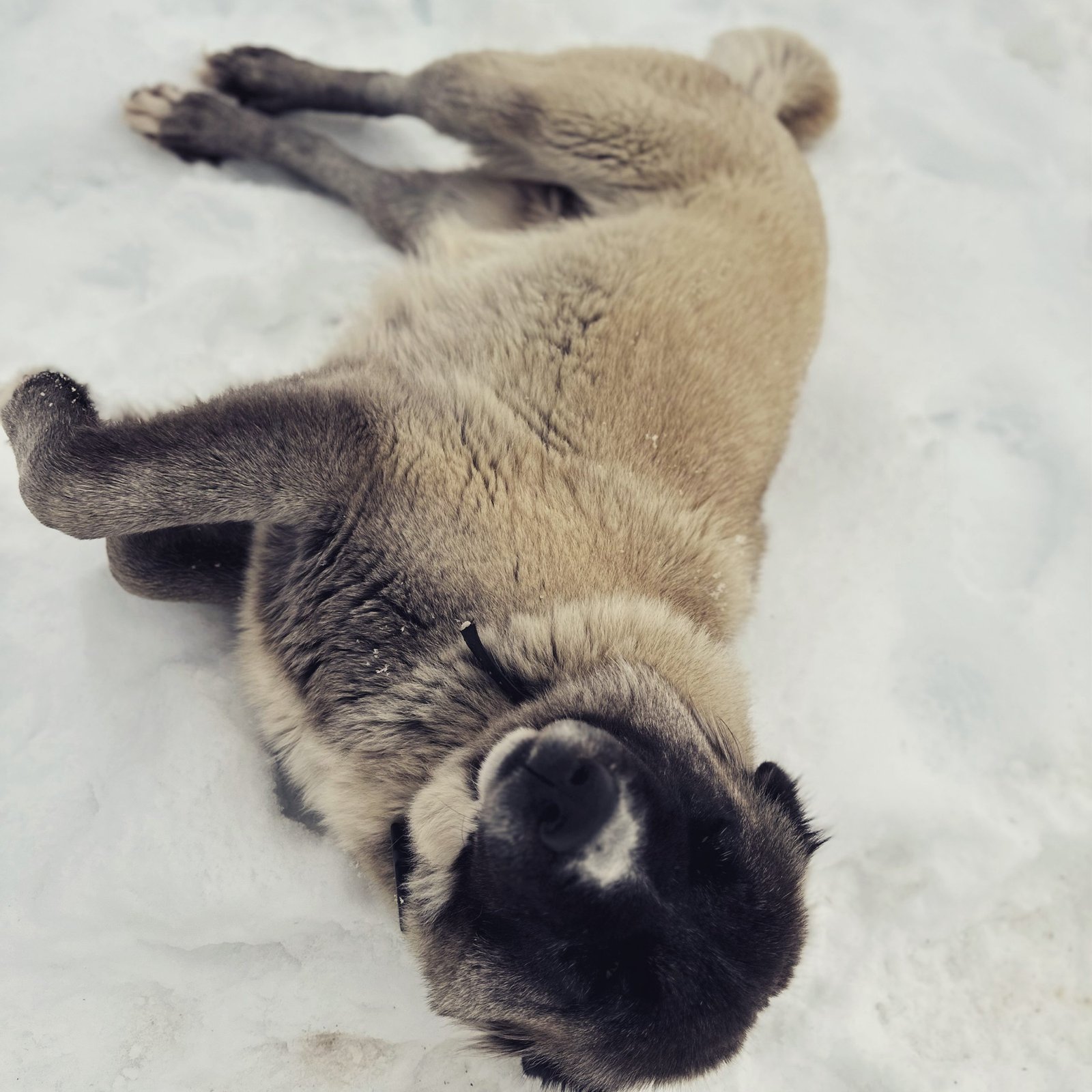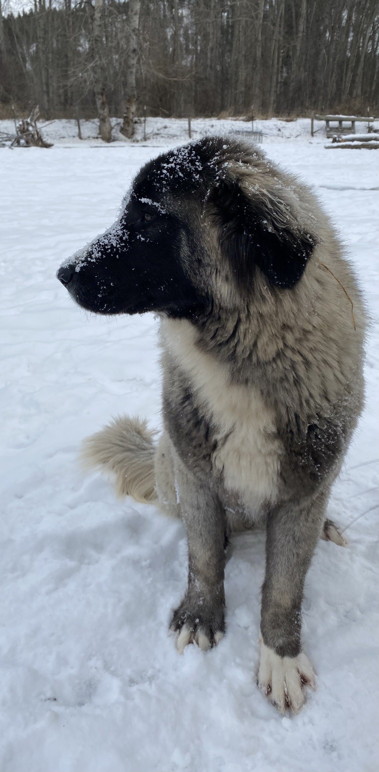 Sevy is a gray fawn, black mask with a rough coat. She is shorter at the shoulder than average, but she flies through snow banks and is highly effective at her job!